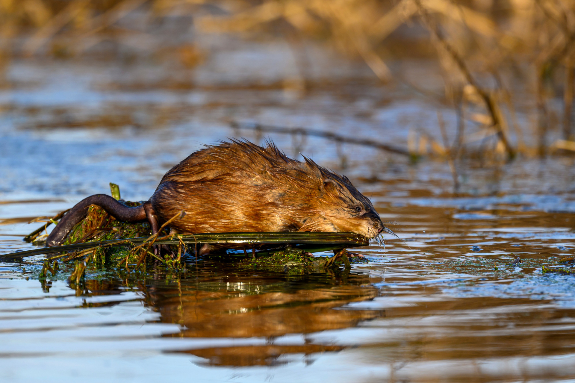 Река сильно разлилась, в верх по течению упорно плыл бобер.