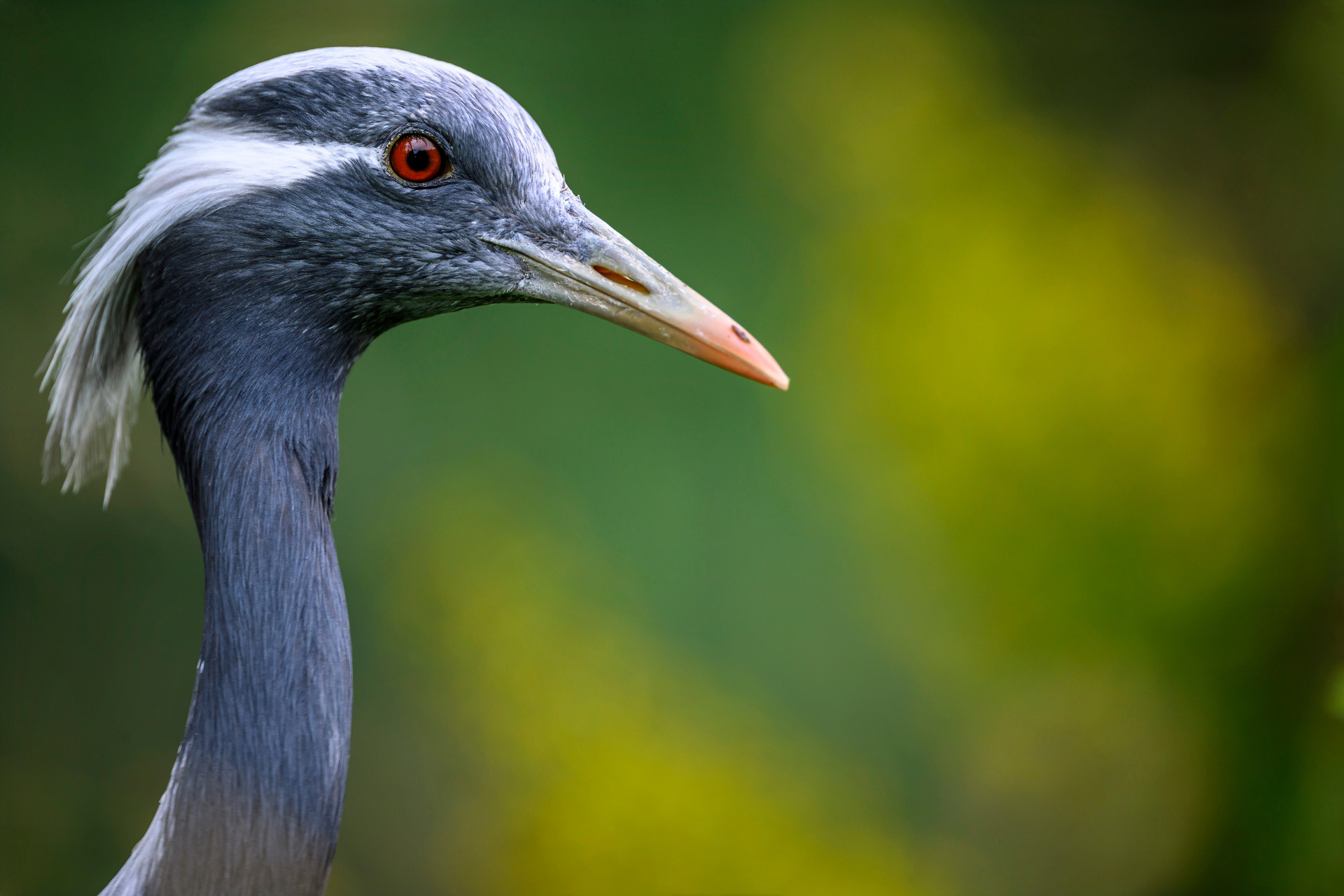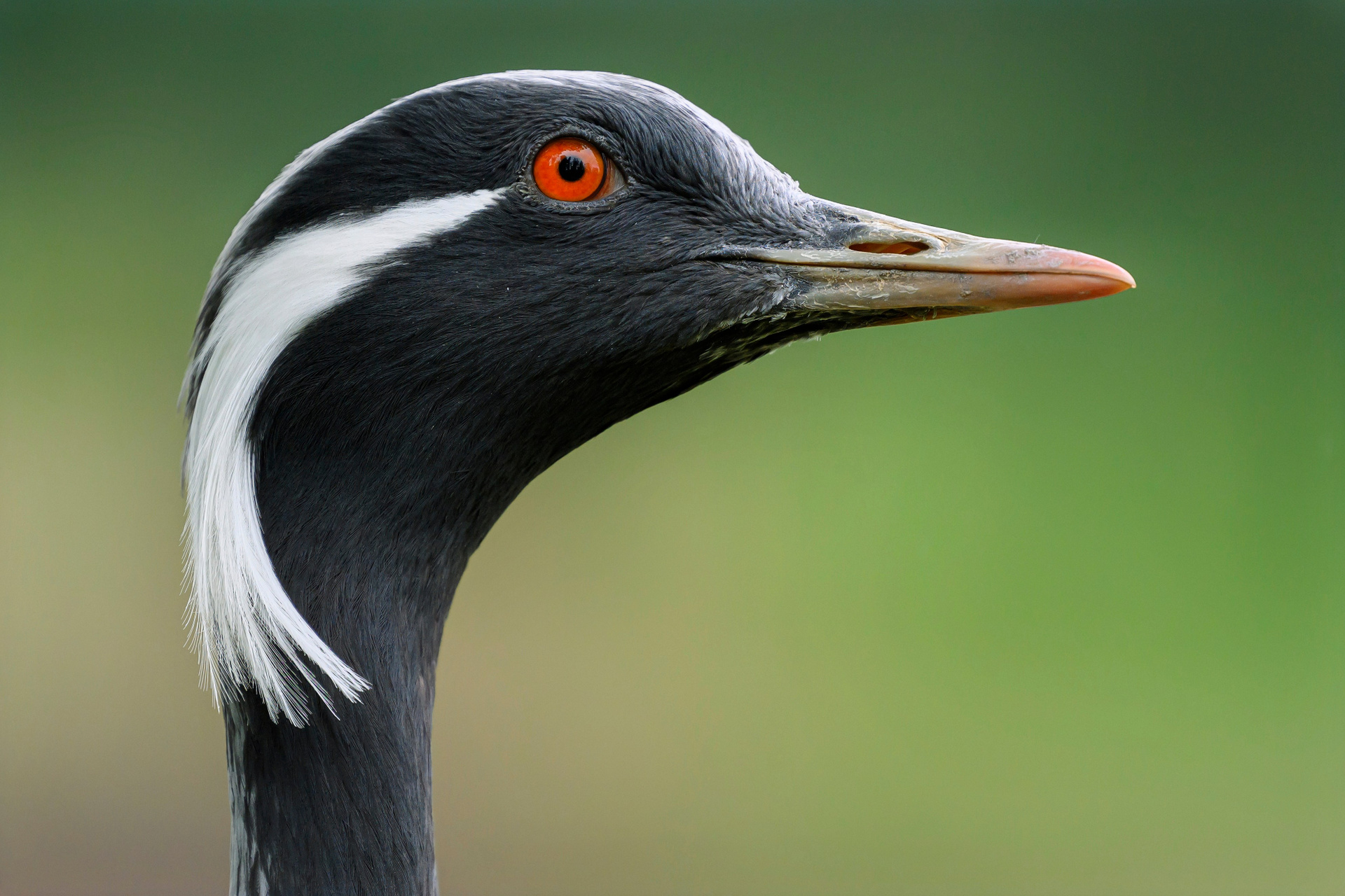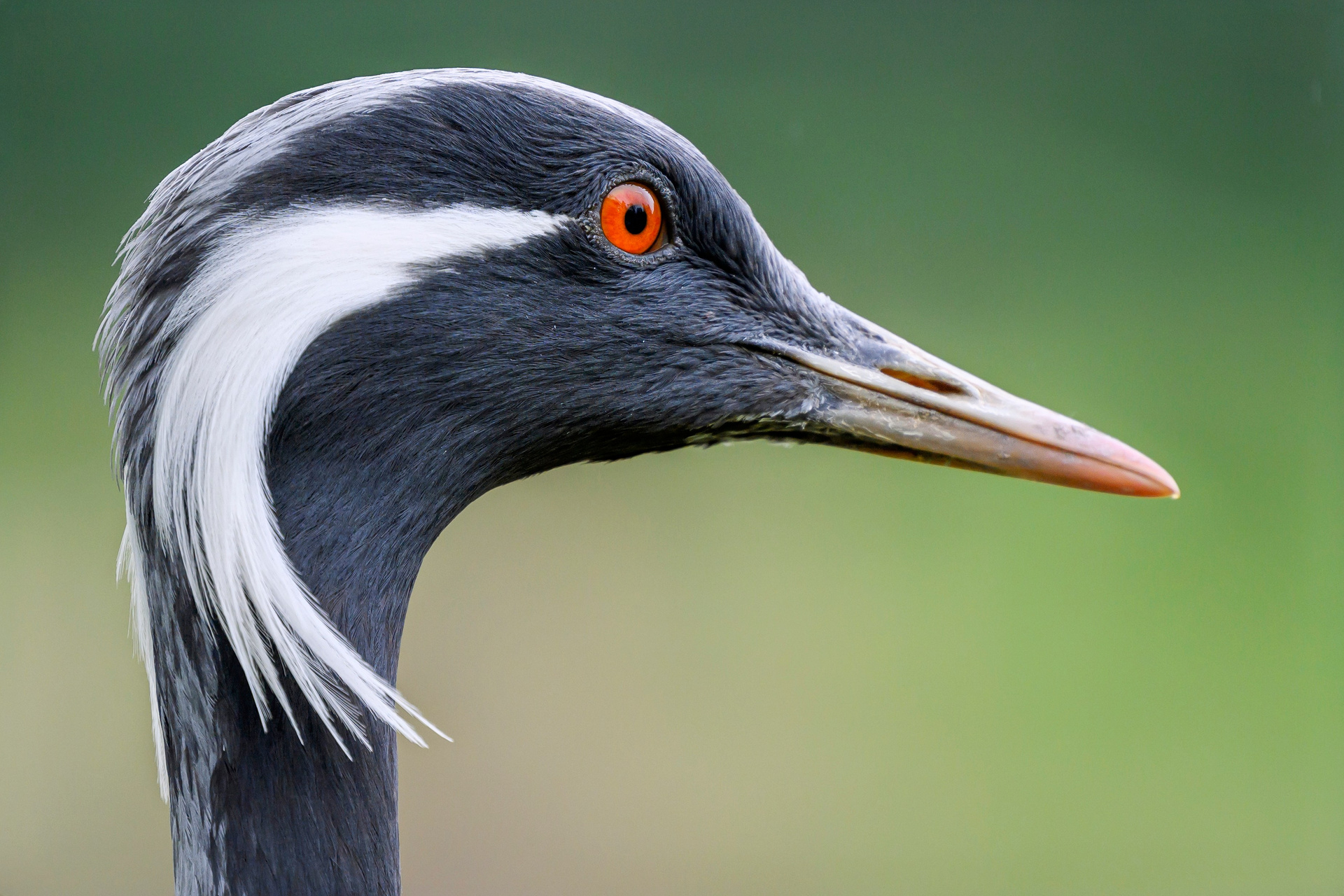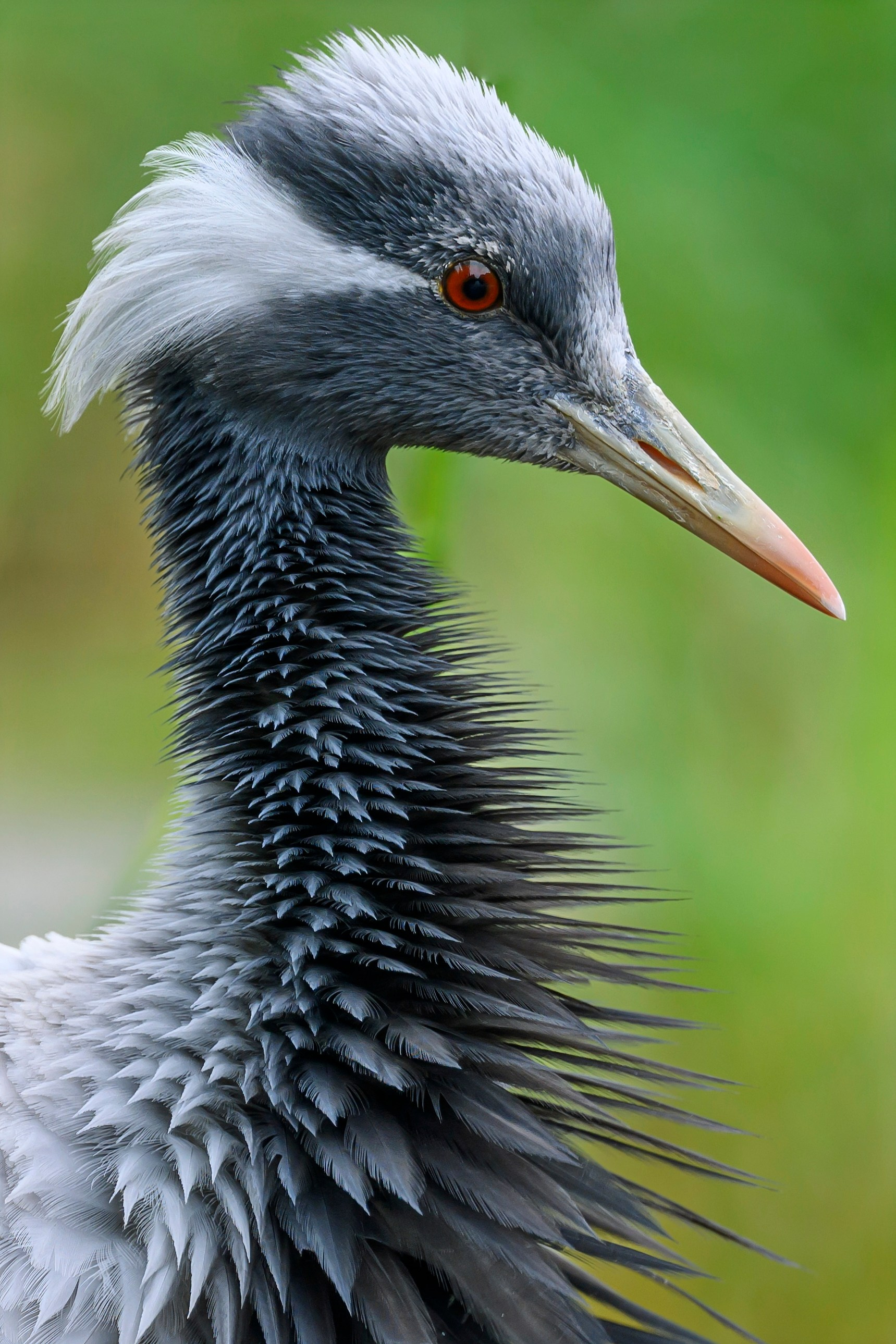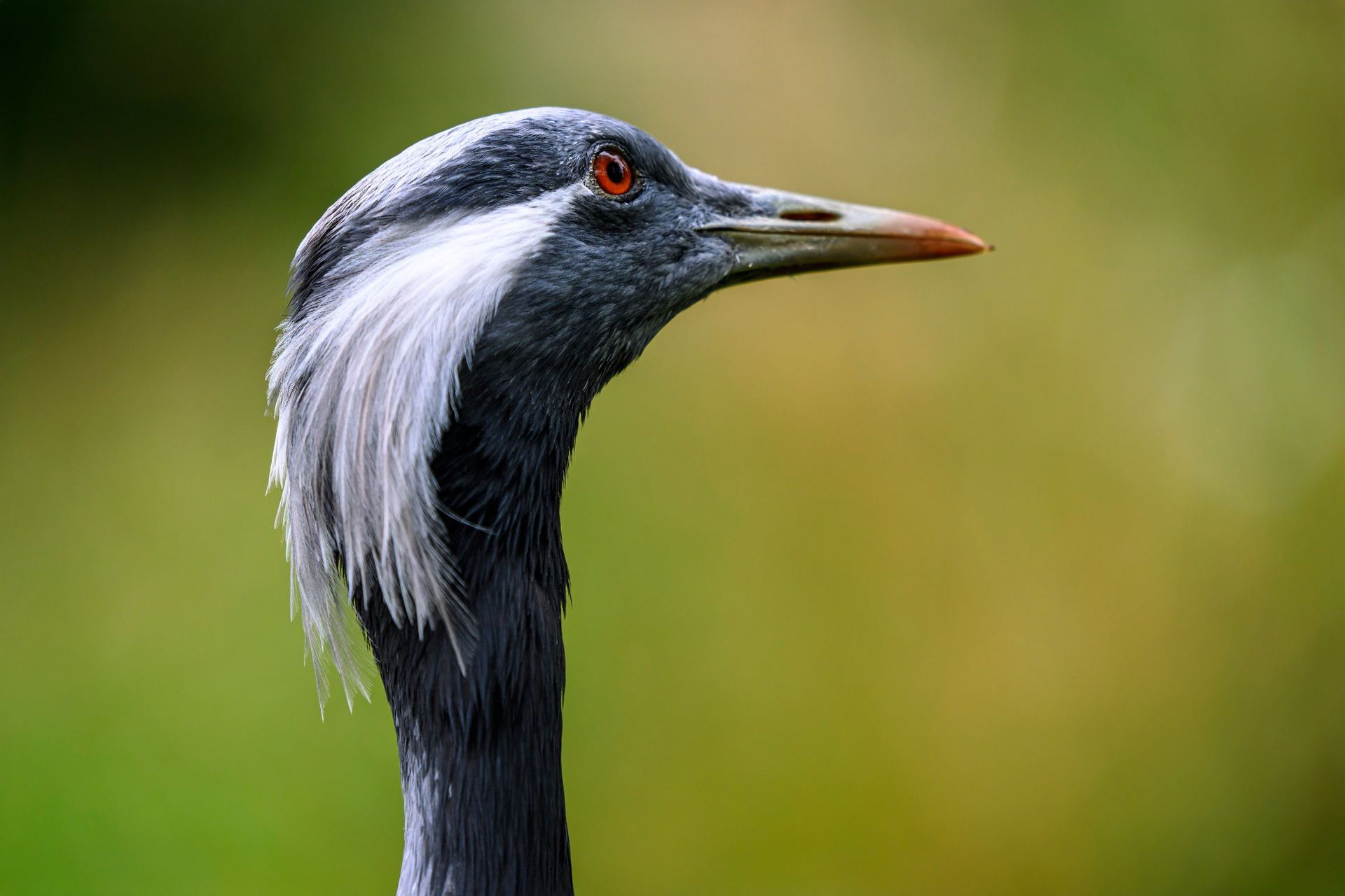 Журавль-красавка — самый миниатюрный и изящный представитель семейства, обитающий в открытых степях и полупустынях Евразии. Несмотря на свои малые размеры, эта птица обладает невероятной выносливостью, совершая во время миграции экстремальные перелеты через Гималаи на высоте до 8000 метров. В кадре красавка выделяется особым аристократизмом: длинными белыми перьями за глазами и глубоким, пронзительным взглядом, который подчеркивает её уникальный характер.