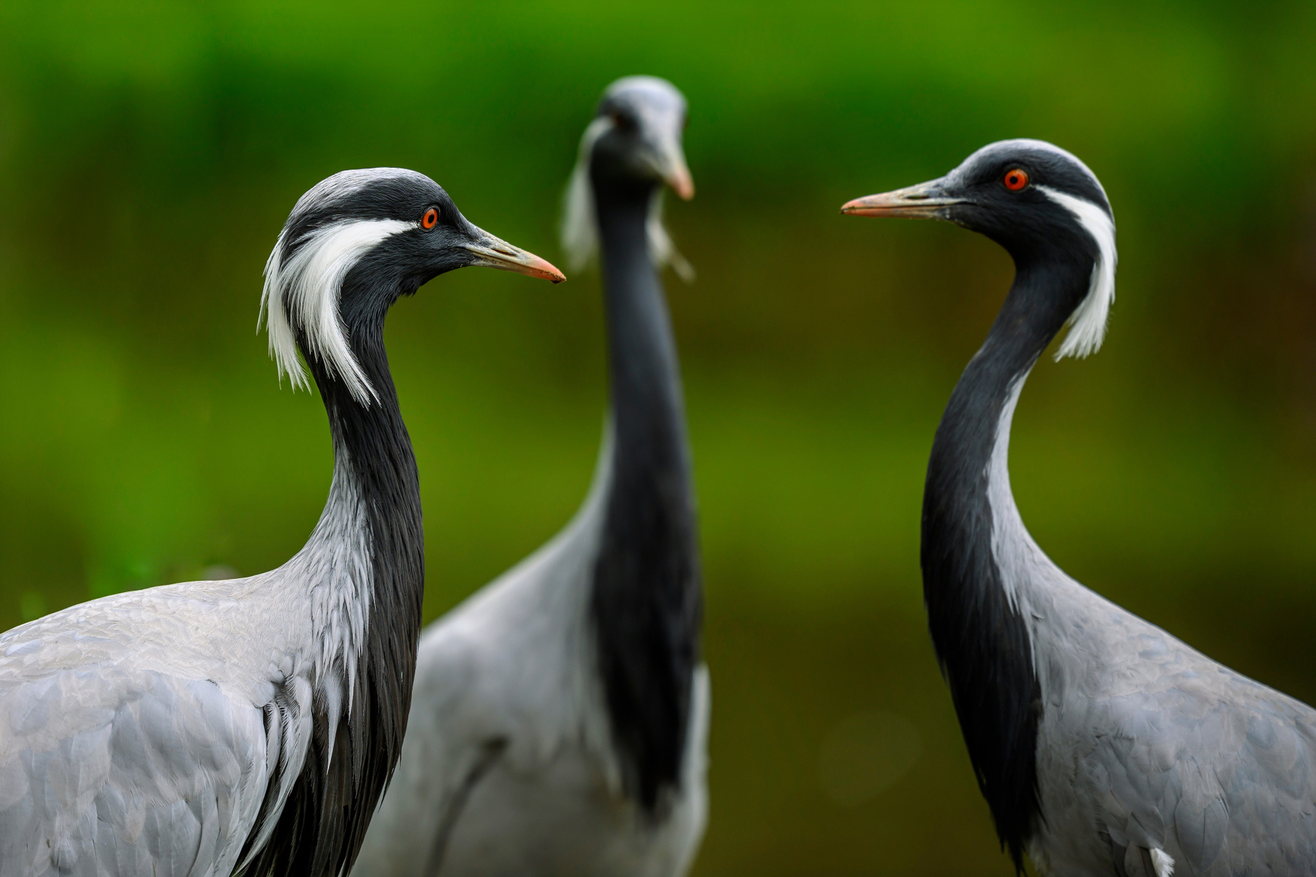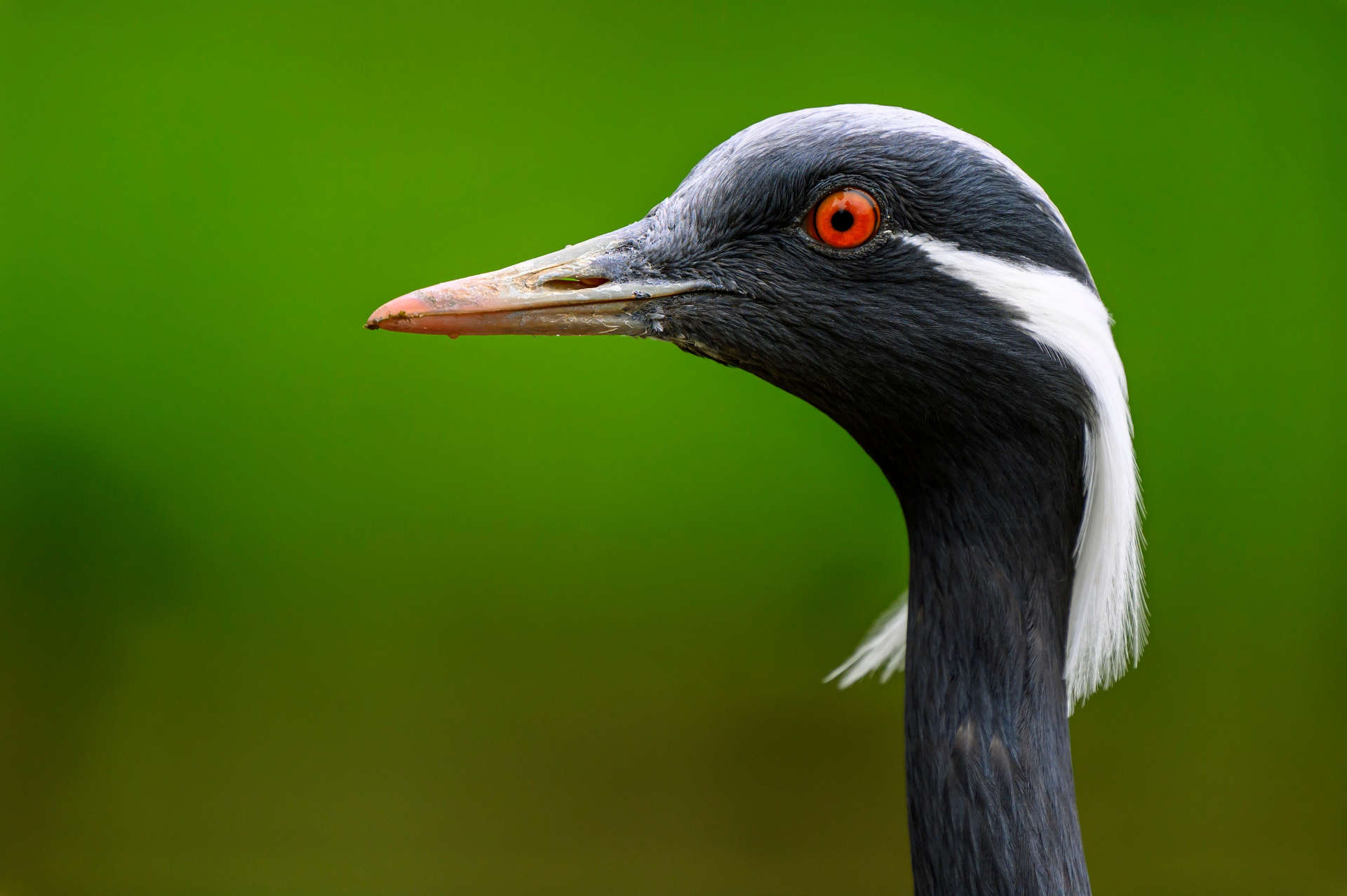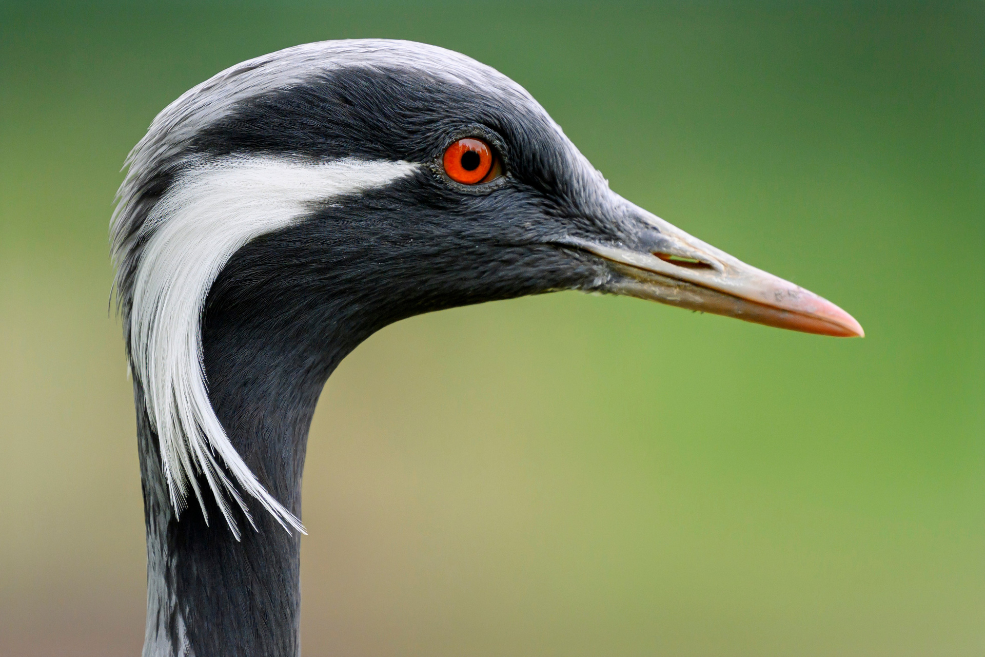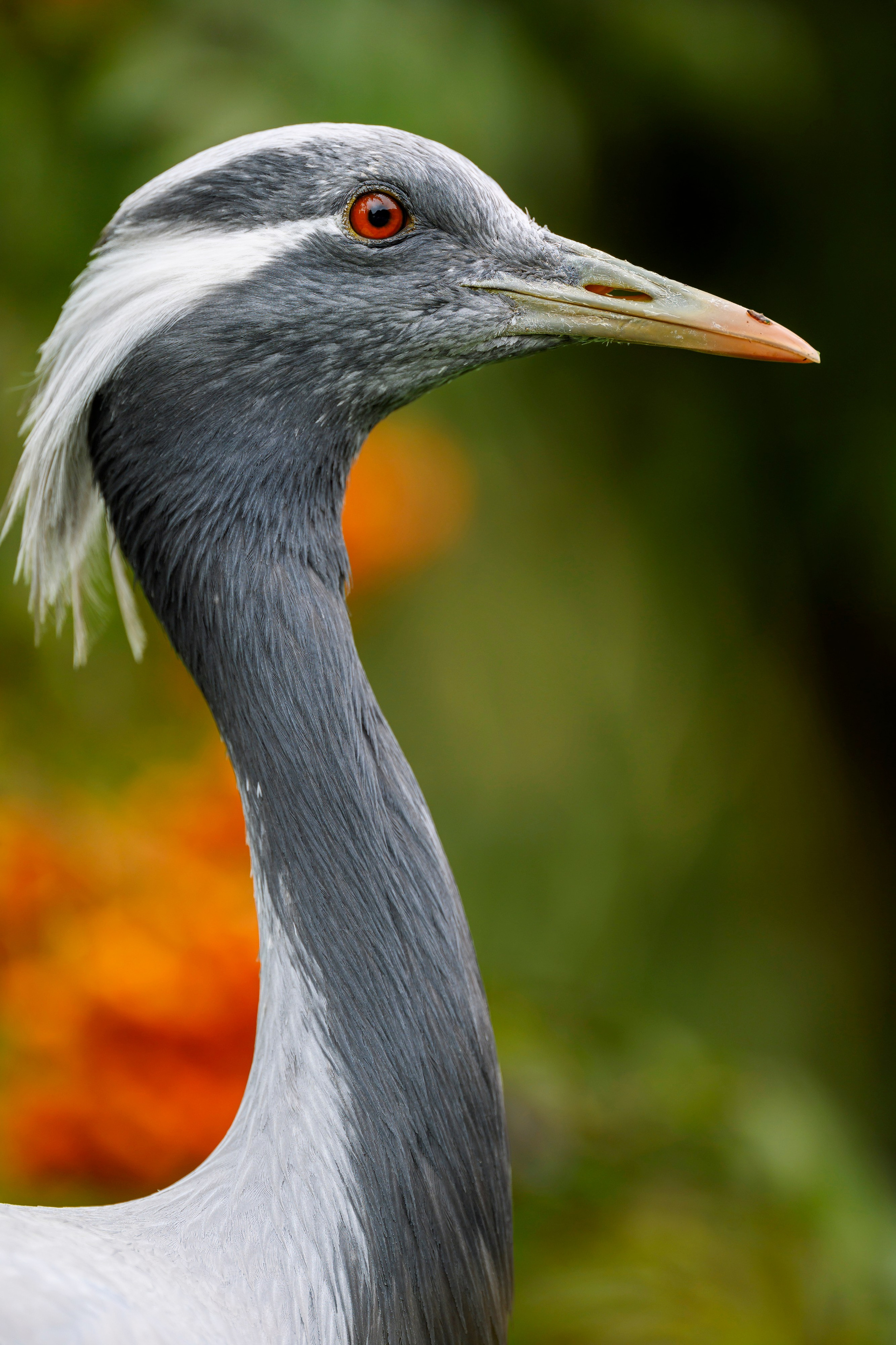 Журавль-красавка — самый миниатюрный и изящный представитель семейства, обитающий в открытых степях и полупустынях Евразии. Несмотря на свои малые размеры, эта птица обладает невероятной выносливостью, совершая во время миграции экстремальные перелеты через Гималаи на высоте до 8000 метров. В кадре красавка выделяется особым аристократизмом: длинными белыми перьями за глазами и глубоким, пронзительным взглядом, который подчеркивает её уникальный характер.
