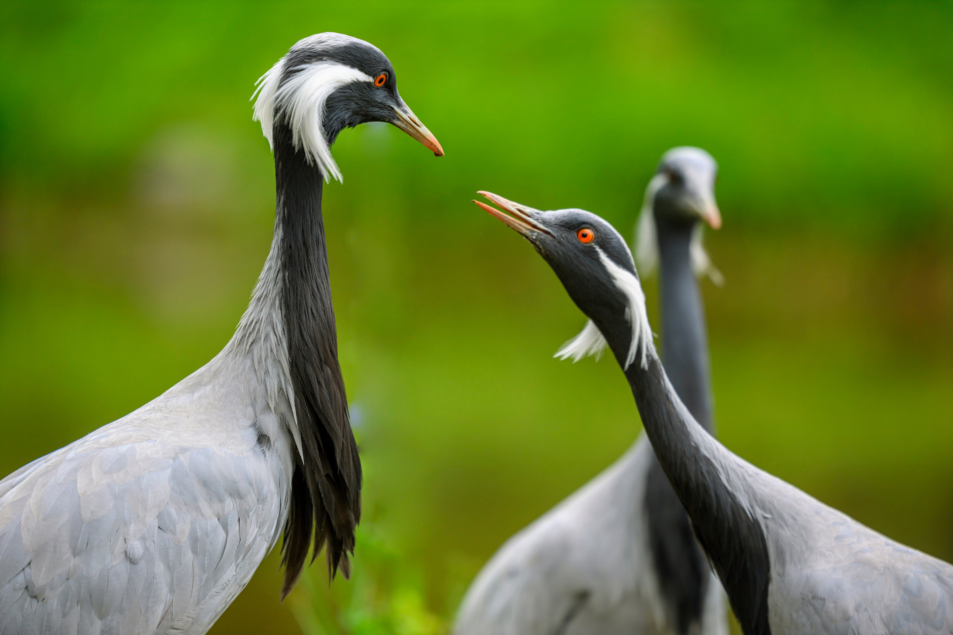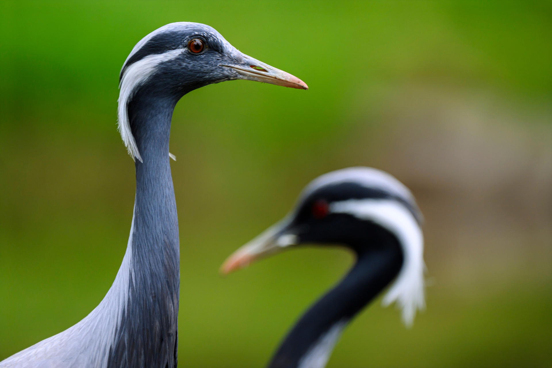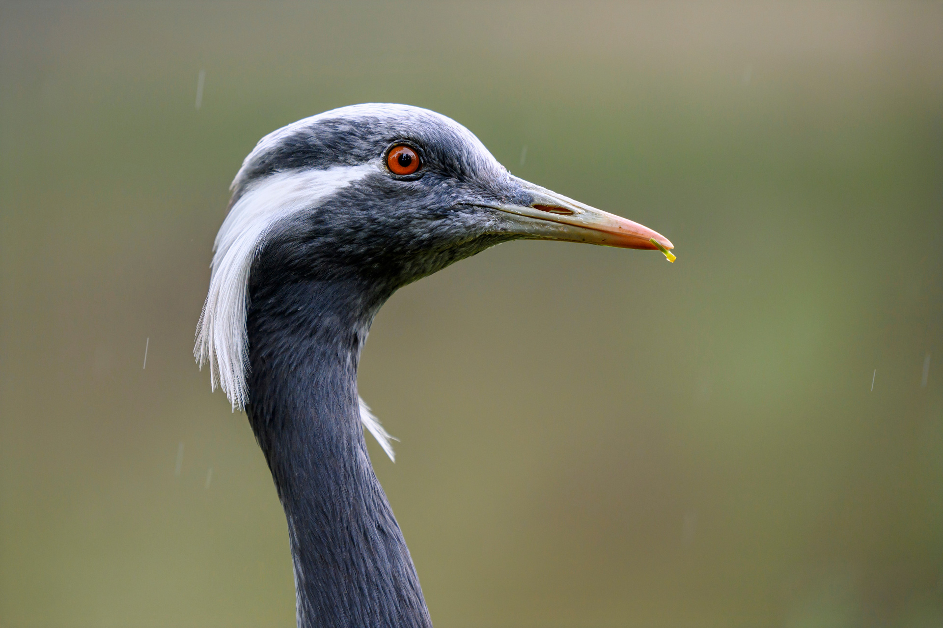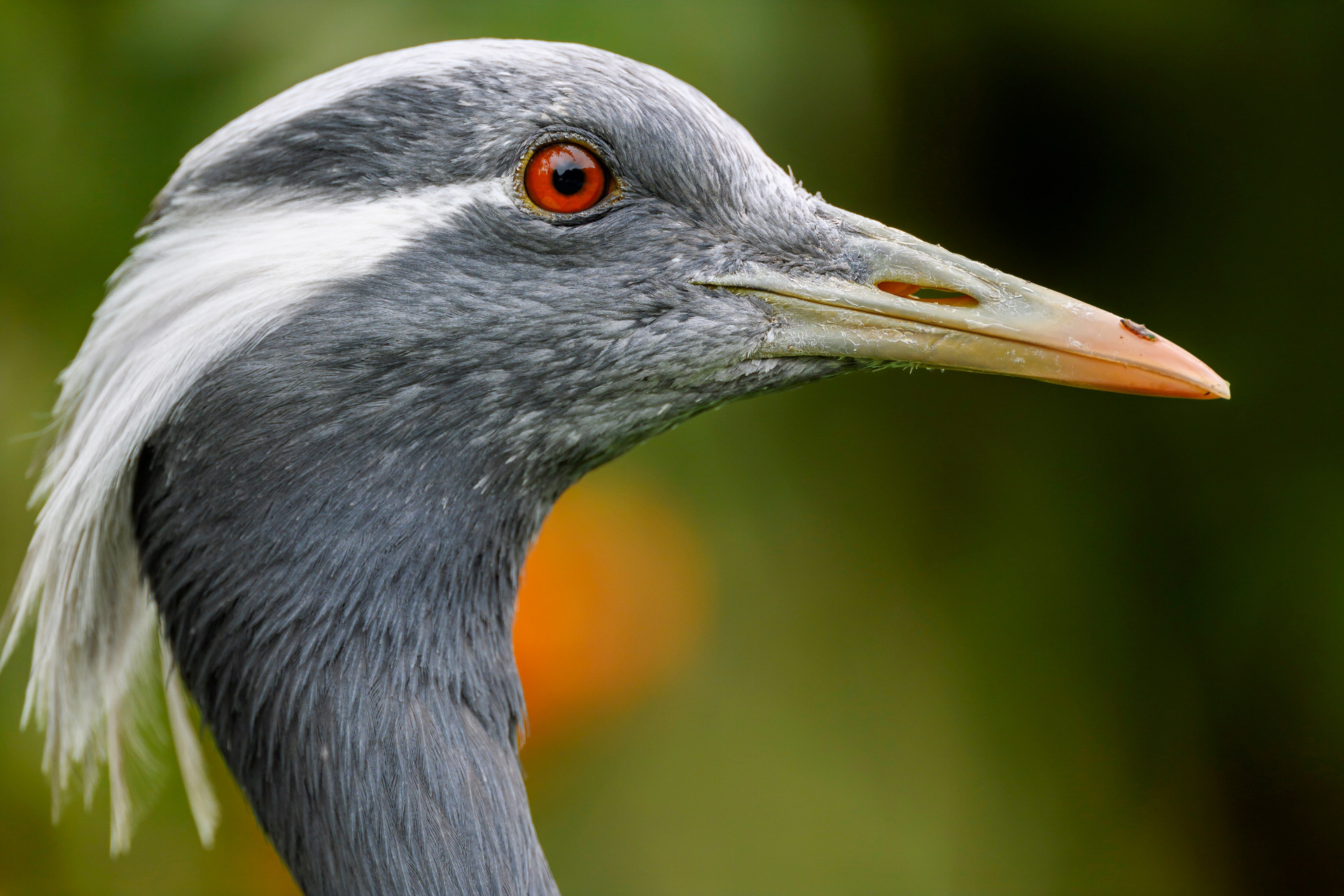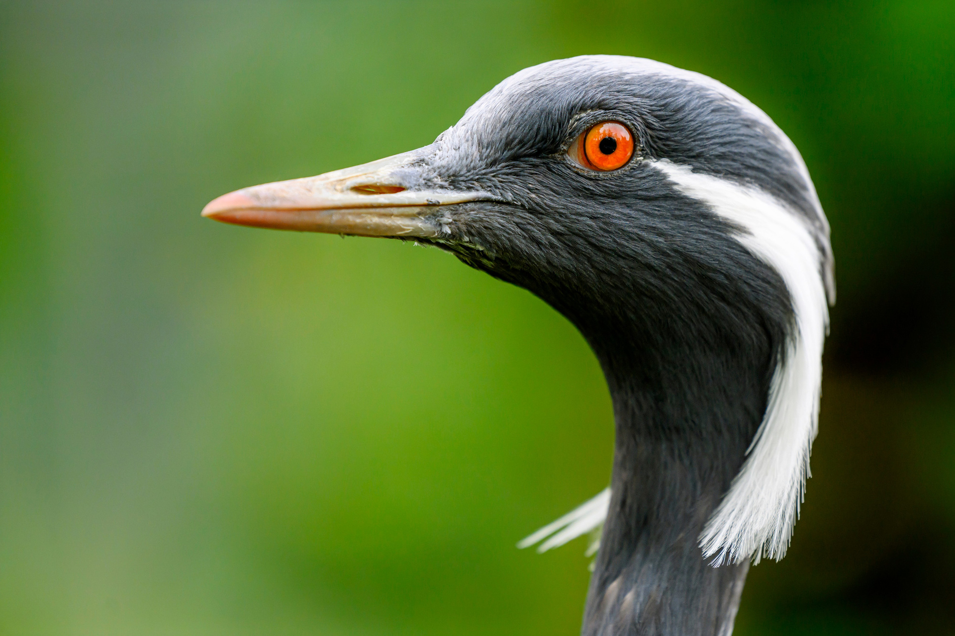 Журавль-красавка — самый миниатюрный и изящный представитель семейства, обитающий в открытых степях и полупустынях Евразии. Несмотря на свои малые размеры, эта птица обладает невероятной выносливостью, совершая во время миграции экстремальные перелеты через Гималаи на высоте до 8000 метров. В кадре красавка выделяется особым аристократизмом: длинными белыми перьями за глазами и глубоким, пронзительным взглядом, который подчеркивает её уникальный характер.